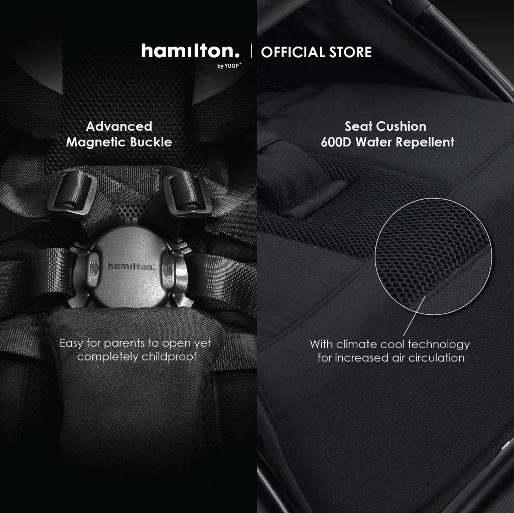 Conforms with EN 1888 safety standards, ensuring your child’s safety with brand new 5 points magnetic buckle harness system and large pedal one-link brake system. With a cutting-edge anodized frame, 5-point safety harness system with advanced magnetic buckle and an easy brake system, the Hamilton X1 Plus strollers offer ultimate ease and safety. No fuss, just features. The perfect combination of safe, strong and simple.