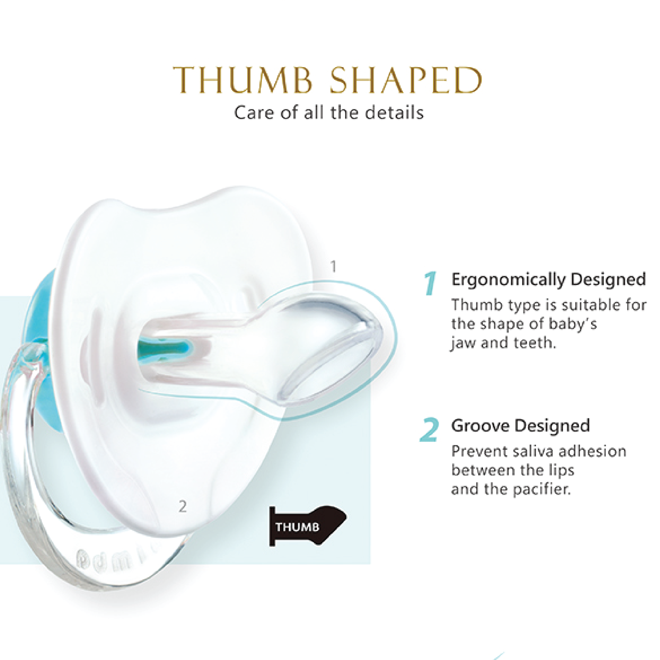●Thumb Shaped: Suitable for the shape of baby’s jaw and teeth. Groove design prevents saliva adhesion between lips and pacifier.