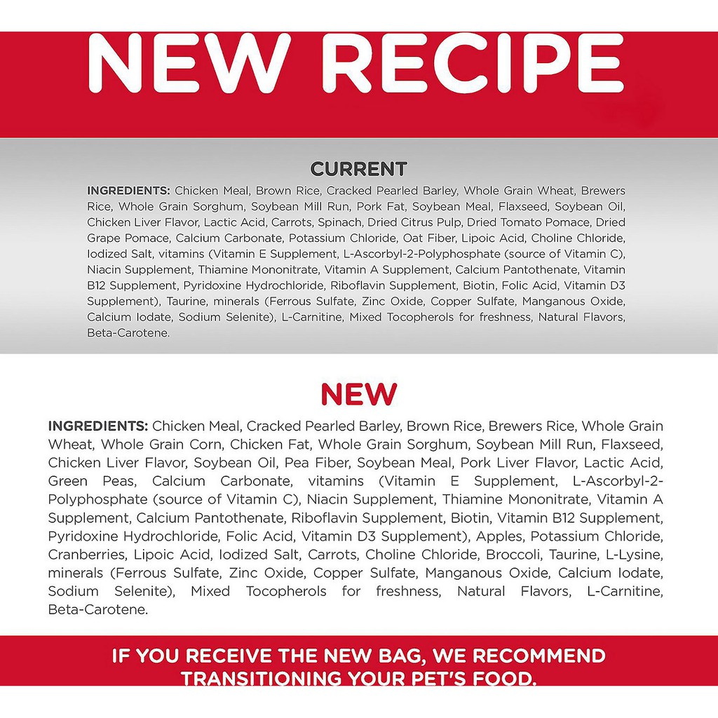 Chicken Meal, Cracked Pearled Barley, Brown Rice, Brewers Rice, Whole Grain Wheat, Whole Grain Corn, Chicken Fat, Whole Grain Sorghum, Soybean Mill Run, Flaxseed, Chicken Liver Flavor, Soybean Oil, Pea Fiber, Soybean Meal, Pork Liver Flavor, Lactic Acid, Green Peas, Calcium Carbonate, vitamins (Vitamin E Supplement, L-Ascorbyl-2-Polyphosphate (source of Vitamin C), Niacin Supplement, Thiamine Mononitrate, Vitamin A Supplement, Calcium Pantothenate, Riboflavin Supplement, Biotin, Vitamin B12 Supplement, Pyridoxine Hydrochloride, Folic Acid, Vitamin D3 Supplement), Apples, Potassium Chloride, Cranberries, Lipoic Acid, Iodized Salt, Carrots, Choline Chloride, Broccoli, Taurine, L-Lysine, minerals (Ferrous Sulfate, Zinc Oxide, Copper Sulfate, Manganous Oxide, Calcium Iodate, Sodium Selenite), Mixed Tocopherols for freshness, Natural Flavors, L-Carnitine, Beta-Carotene.