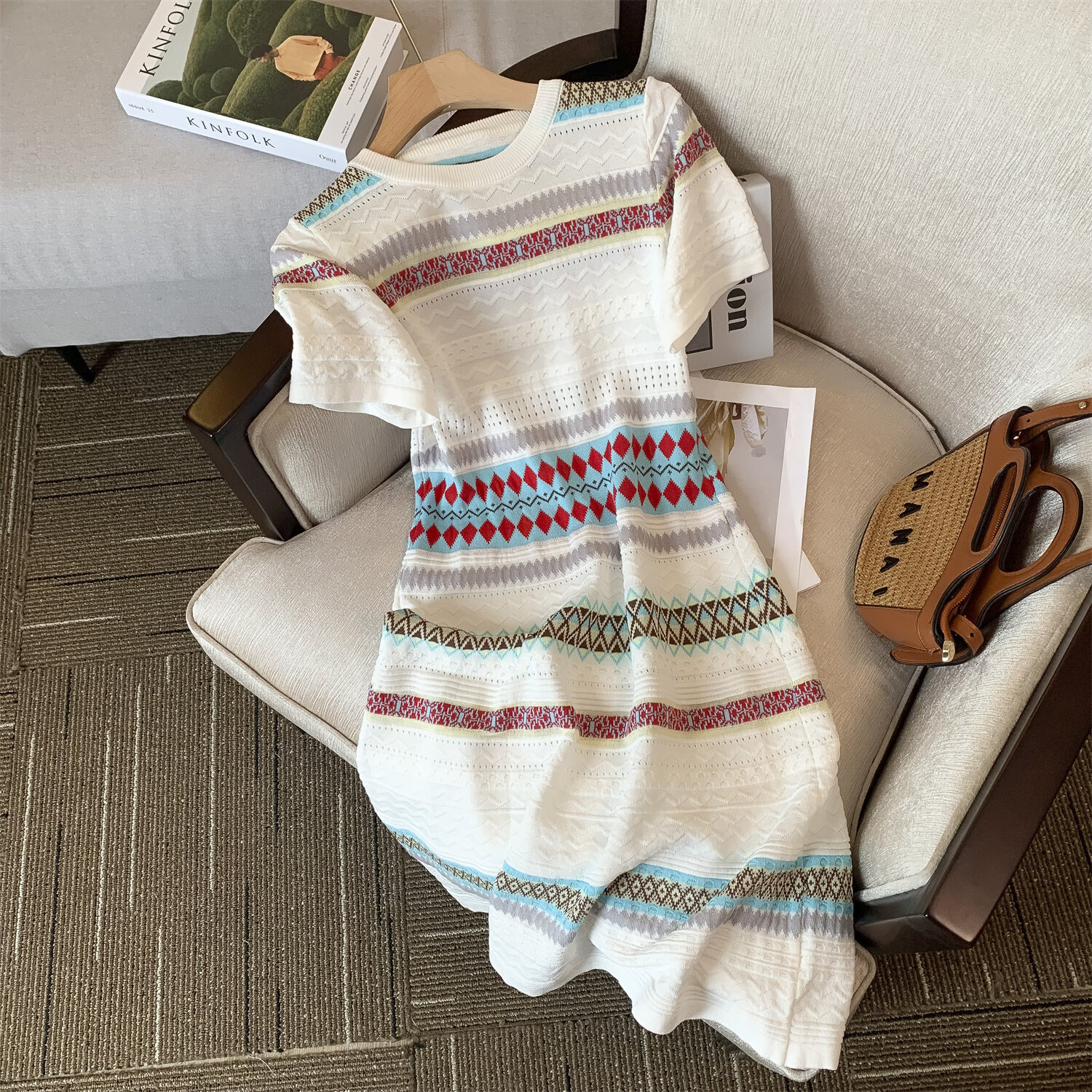 Missliu Fashion Women's Light Luxury Small Fragrance Dress Summer New High-End Elegant Striped Ice Silk Knitted Short Sleeve Skirt