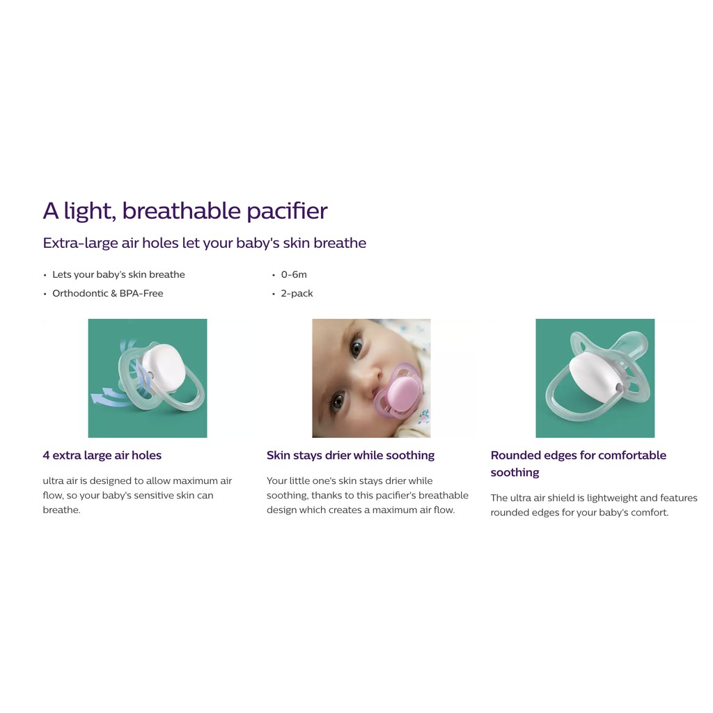 Soothe your baby with a pacifier that lets its skin breathe. The Philips Avent ultra air has extra large holes to keep skin dry. Its lightweight shield is designed for maximum air flow. Available in various colors and designs