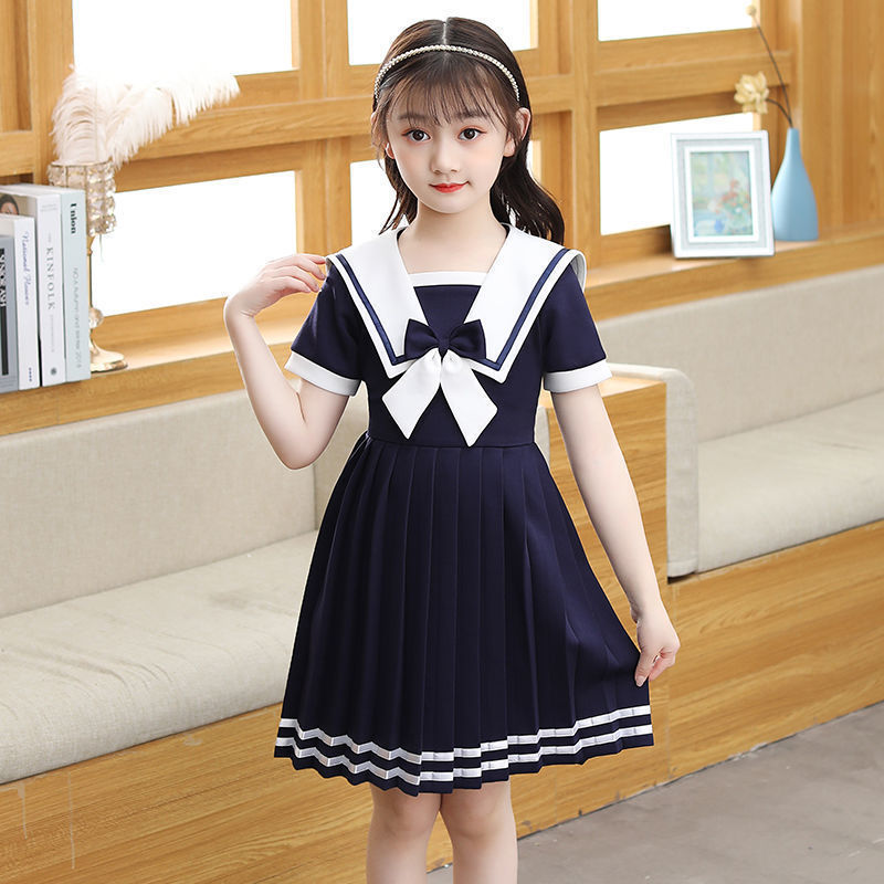 This girl's short-sleeved dress is perfect for summer. It has a stylish design that will make your child look like a princess in a Lolita or JK fashion. The navy blue color fits well with the nautical theme, and the dress has a playful and elegant feel to it. Made for young girls, this dress is perfect for any dress-up occasion, from parties to family gatherings.