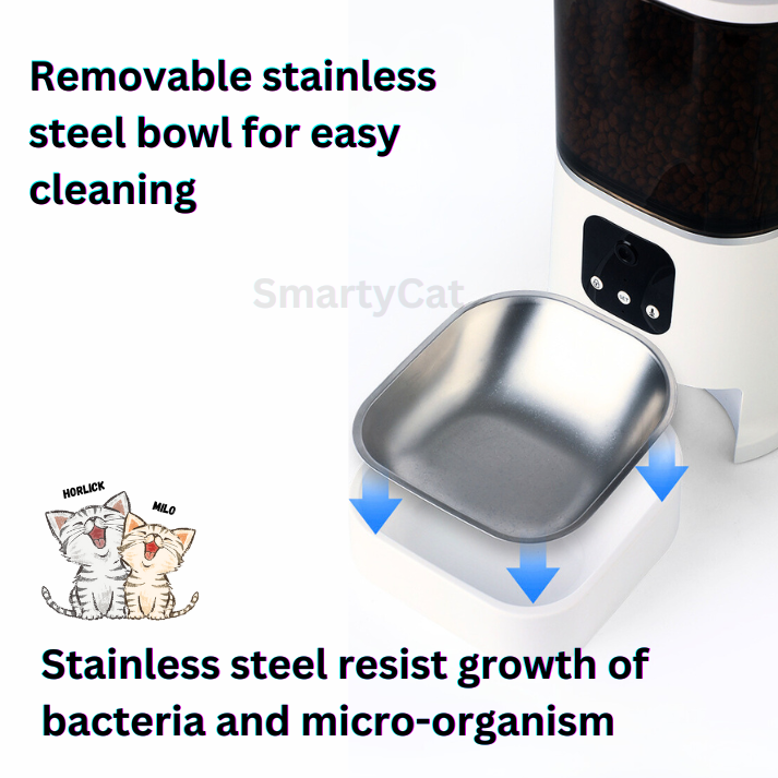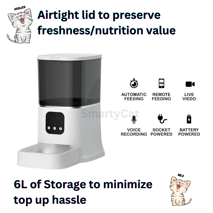 Smarty Cat Automatic Cat Feeder is a revolutionary solution that combines convenience, surveillance, and freshness for cat owners. With its programmable timer, you can easily set feeding schedules tailored to your cat’s needs, ensuring they are fed on time, every time.