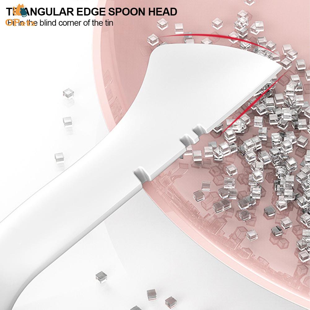 The scoop is with a curve shape head, it can fix can inside very well, can scoop food out easily.