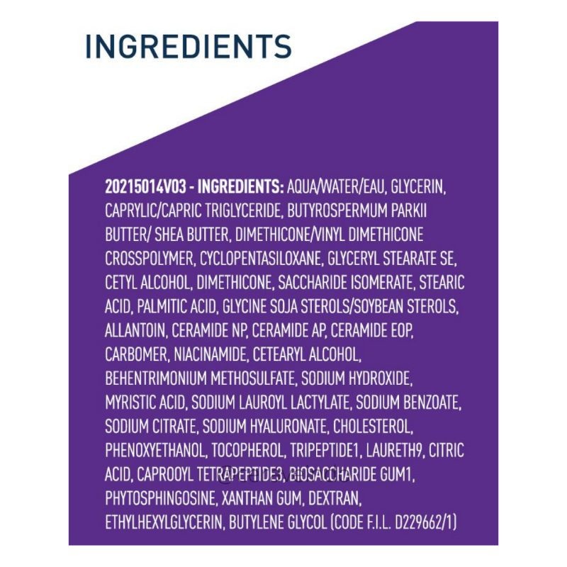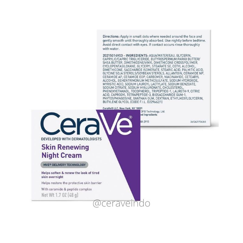 CeraVe Skin Renewing Night Cream 100% ORIGINAL FROM USA Nighttime is the skin's opportunity to help renew itself, and a properly formulated night cream provides hydration and rejuvenation benefits. CeraVe Skin Renewing Night Cream designed with hyaluronic acid, niacinamide, and ceramide to hydrate, soothe, and restore the skin barrier, while also featuring peptides to help improve the appearance of tired skin. Suitable for all skin types, CeraVe Skin Renewing Night Cream has a complex of biomimetic peptides, hyaluronic acid and 3 essential ceramides that work together to lock in skin moisture and help restore your skin's protective barrier overnight. Our non-greasy, deeply moisturizing skin renewing night cream is designed to soften and renew the appearance of tired skin, and our patented MVE technology encapsulates ceramides to ensure efficient delivery within the skin barrier and slow release over time. Supports your protective skin barrier, long after you've finished applying - so you can wake up looking rested and rejuvenated. BENEFIT : Helps soften and renew the appearance of tired skin overnight Provides intense hydration MVE Technology: This patented delivery system continuously releases moisturizing ingredients for overnight hydration Biomimetic peptides: Improve the appearance of tired looking skin Ceramides: Helps restore and maintain the skin's natural barrier Hyaluronic acid: Helps retain skin's natural moisture Niacinamide: Helps soothe skin Non-comedogenic and fragrance free Developed with dermatologists HOW TO USE: - Apply in small dots if needed around the face - Blend gently until completely absorbed - Use every night before bed