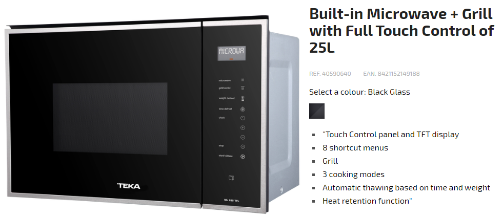TEKA ML 825 TFL 25L BUILT-IN MICROWAVE OVEN WITH GRILL AND TOUCH CONTROL