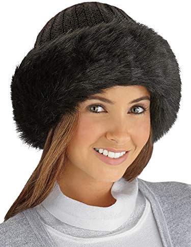 This stylish, knit hat is beautifully accented with fashionable faux fur Hand wash Polyester knit and plush acrylic looks like real fur; imported One size fits all| 8 1/2" Dia| x 8" H