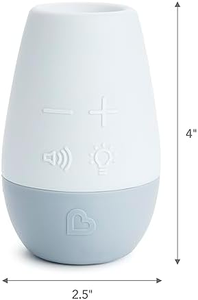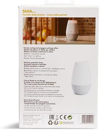 Portable light and sound machine calms little ones with three different sounds - shushing, heartbeat and white noise    3-D icons make it easy to find and toggle sound, volume and light controls in a dark or dim setting    Soft night light can glow solid or pulse in sync with the selected sound    Auto shut-off timer for 10, 20 and 30 minute increments - 30 minute maximum conserves battery life    Battery operated, portable and perfect for on-the-go    Requires 2 AA batteries (not included). To change the battery, simply line up battery and lock icon.    Makes a great baby shower (or anytime) gift for new parents