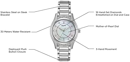 Bulova Ladies' Classic Diamond 3-Hand Quartz Stainless Steel Watch, 16 Diamonds, Mother-of-Pearl Dial, Curved Mineral Crystal