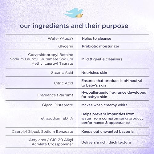 FROM TIP TO TOE: Baby Dove Calming Moisture Hypoallergenic Baby Wash (13 oz.) is a gentle baby wash with a calming chamomile scent for a soothing bath before bed SAFETY-TESTED: Our caring baby wash and shampoo formulas are created without dyes, parabens, phthalates, or sulfates and ophthalmologist, dermatologist, and pediatrician tested NOURISHING BABY WASH: Made with 100% skin-natural nutrients, which are nutrients identical to those naturally found in skin, and prebiotic moisture to support baby’s skin natural health GENTLY CLEANSES: The rich, creamy lather of this sensitive baby bath wash leaves baby's skin feeling clean, soft, and hydrated. It's also effective as a handwash HYPOALLERGENIC SKIN CARE: Our tear-free and hypoallergenic baby wash is recommended by 4 out of 5 parents* for a calming sleep routine. * external survey in the US over 250 persons (2018) WE’RE HERE WITH YOU: Baby Dove and our baby bath and body items support maternal mental health by partnering with Postpartum Support International #162 in Baby ( ) #3 in #4 in