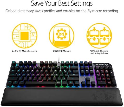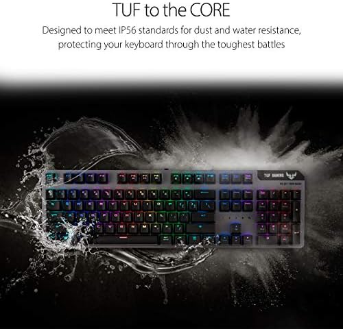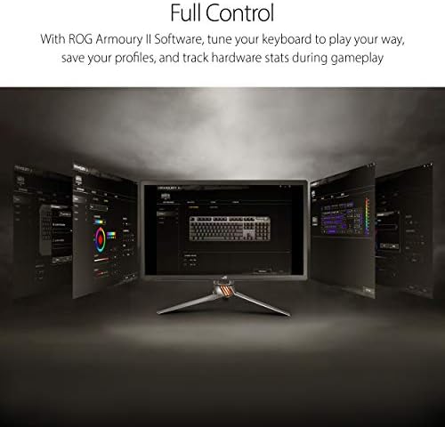 Optical mech switches deliver fast response time for light speed gaming Frameless design with aircraft grade aluminum faceplate to withstand 100 million keystrokes IP56 specialized coating and spill resistance for extended durability Asus Aura Sync RGB lighting features a nearly endless spectrum of colors with the ability to synchronize effects across an ever expanding ecosystem of AURA Sync enabled products Rog Armory II software for easy customization of buttons, profiles, and adjusting performance or lighting settings