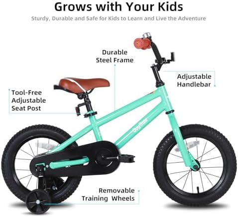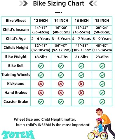DESIGN FOR KIDS - 1. This Kids bike comes with stable training wheel early rider. 2.Quick release seat simplify the height adjustment. 3.Saddle with holder to learn riding when the training wheel is off. 4.Foot brake suitable for young rider don't have enough power to manipulate the hand brake.    MINIMUM MAINTENANCE - Made of premium steel to survive the bumps of learning, the durable steel frame is backed by our limited lifetime warranty. The bike comes with black tire & single speed, only little maintenance needed due to the simple design.    DIY DECAL & SAFE CHAIN GURAD - Your child will get a DIY decal, they could make a unique bike with the decal by sticking their name on the frame or chain guard. The chain guard well protects the chain, it will last longer than other bikes, your child will not get hurt when try to touch the chain.    EASY TO INSTALL - The children bike comes with 85% Pre-assembled body and the basic assembly tools, only pump needed for tire, normally takes a novice about 20 minutes to assemble it. If you have problem about assembly or the bike, please contact us.    RECOMMENDED SIZE CHART - 12" BIKE FOR 2-4 YEARS (33"-41") TODDLER, 14" bike for 3-5 years (35" - 47") child, 16" bike for 4-7 years (41" - 53") boys & girls, 18" bike for 5-9 years (43"-59") boys & girls. Note: child height may vary even at the same age, please take the height into consideration.