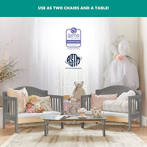 CONVENIENT TRANSITION BED: The Portland 3-in-1 Convertible Toddler Bed sports a low-to-floor design making it easy for your child to get in and out of bed. The bed comes with 4 wooden safety side rails and is reinforced for stability with center legs    3 in 1 CONVERTIBILITY: The Portland converts easily from a toddler bed into 2 kid-sized chairs and a table that complement any room setting. Keeps pace with the changing needs of your growing child. Conversion kit sold separately    BEAUTIFUL AESTHETICS: Whether you want a traditional toddler room or a modern one, the elegant Portland fits in easily with its chic bell-shaped full panel headboard and footboard. Built of New Zealand pinewood, it is available in 5 elegant finishes    SAFETY FOCUS: All our products are designed with the safety of your children in mind. The Portland is JPMA certified & meets/exceeds all applicable ASTM and CPSC standards. It is free of phthalates, latex, lead and BPA    PRODUCTS SPECS: The bed dimensions are 57Lx29Wx28H inches. Each chair measures 29Lx29Wx18H; The table is 29Lx14Wx8H. Choose any Dream On Me non-toxic, Greenguard certified standard crib mattress for a perfect fit. Max weight limit for the bed is 50 lbs