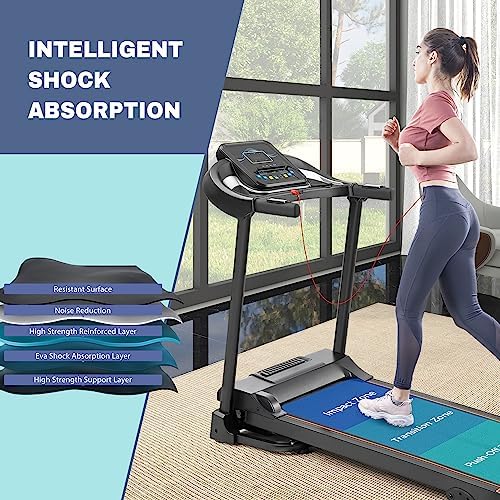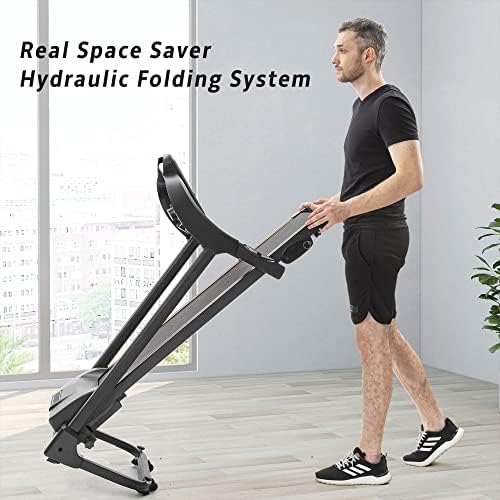 【Multiple Optional Function】As a Merax treadmill user, you can easily get access to the diverse 12 pre-set HIIT running mode from P1 to P12 range between 0.5 to 7.5 MPH with the quick touch of the button. So that you can control the intensity and rhythm of the training as you want to better fit your own exercise goals. 【Best Fit Size】This treadmill with incline provides a large LED display screen to track progress in speed, distance, heart RATE, and calories burned while the 15.5” wide running tread belt gives you the best workout experience. With Integrated Tablet Holder and Dual Cupholders featured on both sides of the LED display keep all auxiliary equipment on standby. 【Foldable & Safety】Merax electric folding treadmill comes fully with all required tools and instructions and assembled, simply unfold it and tighten the screws to start running immediately. And free up floor space by simply folding your treadmill up. Prevent Slipping Belt Design and Emergency Stop Key to ensure your safety. 【Dynamic Workout】The treadmills for home have MP3 and Audio Auxiliary Port, help you stay motivated during your workout by listening to your favorite playlist while running through the built-in dual speakers. Grip pulse Sensors monitor and maintain your target heart rate for optimal fitness results. 【Powerful & Quiet】Premium vacuum 2.5HP motor reduces noise while running indoor and fitted base rolling wheels on the treadmill underside provide easy and simple transport that protect your floors. Merax treadmill diemensions: 52" x 20.6" x 46.5". Folded dimensions: 26.5" x 24.5" x 50". 【Non-Slip Running Belt & Multifunctional LED Display】The 5-layer non-slip texture running belt features a spacious running area(43" x15.5"), providing an effective and safe cushion for your knees and muscles for a superior running experience. The folding treadmill's LED display clearly shows time, speed, distance and calories, monitoring your progress in real time and keeping your movement data at a glance. 【100% Satisfaction & Awesome Service】Merax is committed to providing every customer best possible experience and guaranteeing your satisfaction. Our team is Always Online and ready to help you with any questions you may have.