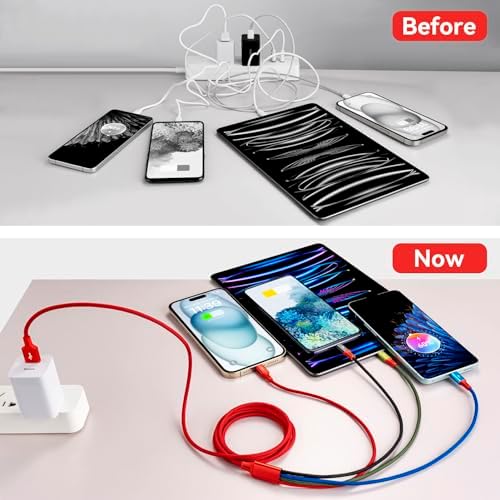 【One for All】: The up-to-date 4 in 1 design which charges most of the cell phones available on market. 【Multi-Function】: 4 in 1 3.5A Nylon braided High Speed multi charging cord compatible with Phone 15 14 13 12 11 Pro Max / 15 14 13 12 11 Pro / 1413 12 Mini / 15 14 Plus / 15 14 13 12 11/ SE / Xs Max / Xs / Xr / X / 8 Plus / 8 / 7 Plus / 7 / 6s Plus / 6s / 6 Plus / 6 / 5 / 5s , Pad Air / Pro, Pod / replacement Nano 7 / Samsung Galaxy S22+ / S22 / S21+ / S21 / S20+ / S20 / 210+ / S10 / S9+ / S9 / S8+ / S8 / Note 7 8 9 10 20, Huawei, HTC, LG, Sony, Google Pixel , Moto, PS 4/5 and other Android devices for most mobile phone charging. 【Universal Design】: No need to carry any other cables when you are in a car, office, home or travelling. 【Charging Fast and Syncing】: The maximum total output current can be up to 3.5A (Total, not each end), charge faster than most 4 in 1 cables and work better for tablets devices (Only iOS Port Support Data Transfer, 480 Mbps Data Transfer). 【Multi-device chargeing】: Please use 5V/3A output power sources, when charging multiple devices at once. 【Warranty】:Minlu provide charging cord has a 30-day return guarantee, a 12-month worry-free warranty and a 7*24 friendly service. If you have any doubts, please contact our service team as soon as possible.