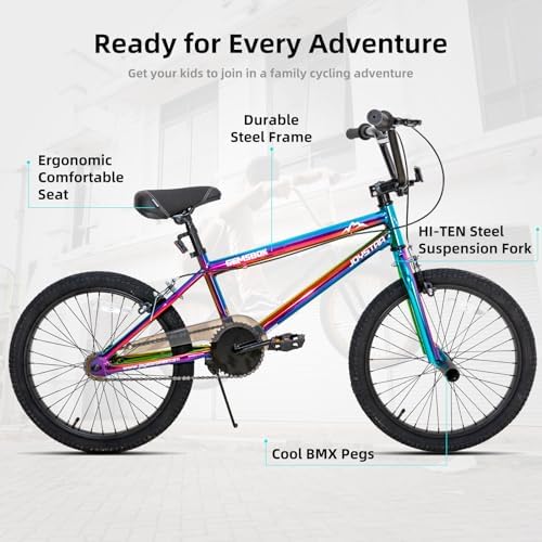 Freestyle & Color - With sleek gloss jelly paint, JOYSTAR Gemsbok is a stylish BMX style 20" kids bike that offers everything a beginning rider needs to hit the streets or bike park! It's an entry level bmx bike with standard 20” wheel size. Front pegs make it easy to try hops and tricks for boys and girls. Safer riding - 20 in kids bicycle with double hand brakes, front & rear caliper brakes provide more safety. Wide 2.125" pneumatic air tires add more stability, Sturdy steel frame and crank, Non-slip resin pedal, chainguard, front & rear reflectors and wheel reflectors. Easier to Ride - Your little ones will enjoy a smoother ride with Single speed drivetrain that features 130mm one-piece forged steel cranks with a 36T steel chainring and American loose ball bottom bracket. Brake lever allows little riders brake efficiently. Kickstand included. Easy Assembly - 85% of the bike is assembled. The front tire, the seat, pegs and handlebar need to be installed. Assembly tools included and it's easy to follow instructions. This boys and girls bike also come with timely customer service and also limited lifetime warranty. 20 Inch BMX Bikes - The Gemsbok bmx bike is ready to take on the sidewalk, dirt track, or park. Special Oil slick color for cool riding. Suggested rider height is 4'0"– 5'8" (ages 7+ years). Use our sizing chart and you will find the perfect size for your kids.