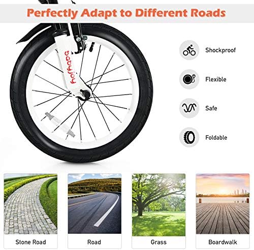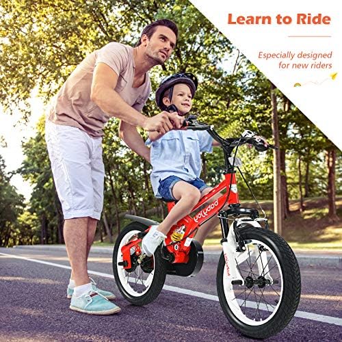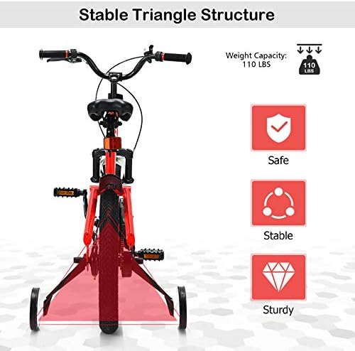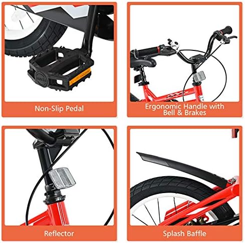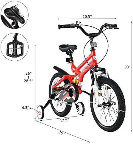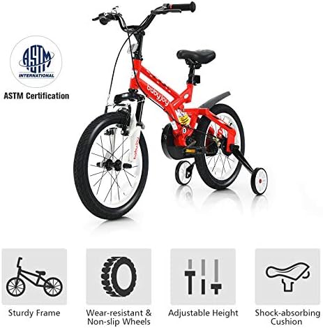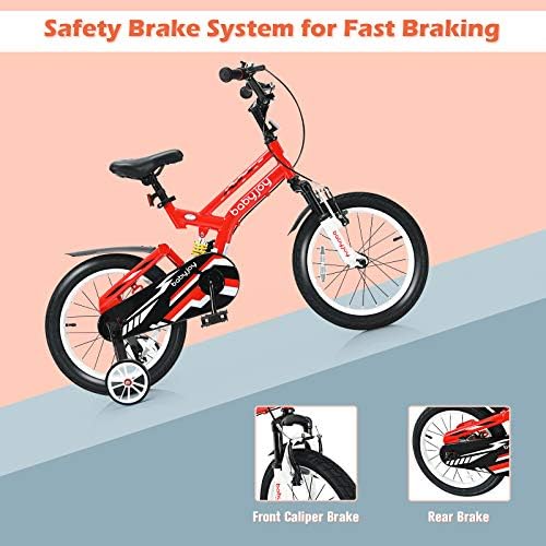 [ Perfect Gift for Little One ]: BABY JOY bikes help kids learn riding skills in a funny way and gradually master their balance. In addition to promoting the development of physical fitness, children's independence can also be effectively improved.    [ Removable Auxiliary Wheels for Easy Riding ]: When children's balance ability or riding skills are not so perfect, 2 auxiliary wheels can help them practice riding stably. Meanwhile, the training wheels can be detached when kids grow up.    [ Height Adjustable Seat ]: The height of the child changes quickly and greatly. In order to perfectly adapt to this change, the saddle height of our bicycle is adjustable. Note: Measure kid’s INSEAM and compare with SADDLE HEIGHT to check if the rider can touch the ground.    [ Shock Absorbing Frame & Safe Brake ]: Our lightweight bicycles are made of carbon steel frames, which provide strong support for children and ensure a long service life. The shock absorbing design provides more comfy riding experience for kids, suitable for rugged ground. What’s more, our kids bike is equipped with double brake (or coaster brake) to ensure children’s safety. The wear-resistant and non-slip tires are suitable for various roads.    [ Simple Installation Process ]: Complete and detailed assembly instructions have been marked on the manual so that you can quickly get a complete training bike. Non-slip pedals, reflector, splash baffle and ergonomic handle with bell provide more convenience.