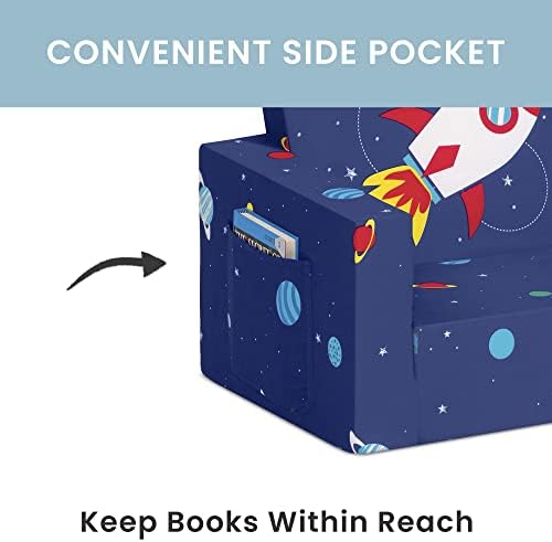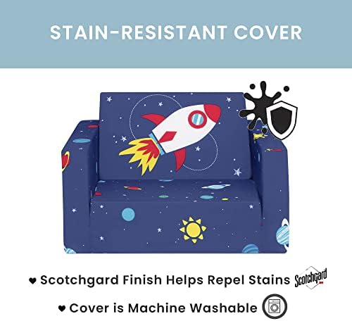 CONVERTIBLE 2-IN-1 DESIGN: This flip-open chair converts to a lounger/sleeper| Ideal for reading, relaxing, playing or sleeping, your child will enjoy this chair with siblings/friends | Recommended for ages 18 months+ | Fits 1 to 2 small children COMFY FOAM CONSTRUCTION: Supportive foam keeps its shape and provides all-day comfort | Soft and durable slipcover features side pocket to keep books/tablet within reach | Lightweight chair is portable, great for bedrooms, playrooms, gaming or studying STAIN-RESISTANT: Keep chair looking new with the built-in Scotchgard stain release finish that helps most stains wash out during normal laundering | Chair features a machine-washable slipcover that zips off STAIN-RESISTANT: Keep chair looking new with the built-in Scotchgard stain release finish that helps most stains wash out during normal laundering | Chair features a machine-washable slipcover that zips off EASY TO UNBOX: Chair ships in super-small box | Once unboxed chair expands 5x (may take 24 hours to fully expand) | Sofa size: 23”W x 17”D x 15”H| Lounger size when flipped open: 17.5”W x 37.5”D x 15”H