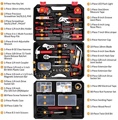 [Toolbox Included] - Includes 1-Drawer storage box with independent sliding drawer to enlarge the capacity more than common toolbox. Assortment of necessary tools are in one tool chest, durable plastic case with internal molded compartments to keep each component protected and easily accessible. All tools meet or exceed ANSI standard. [High Quality Material] - Made of high-quality steel and finished in heat treated chrome, durable and corrosion resistance. Handles made of TPR material, comfortable for grip. [Muti-purpose Tools Kit] - 325Pcs tools set for most small repairs and DIY projects around the house. It is perfect for handyman, construction workers, mechanics, work shops etc. This tool set is also a good gift choice for family member, friends, partners, etc. [Complete Varieties] - Comprehensive assortment of professional-grade wrenches, a complete range of 1/4 inch and 3/8 inch metric-sized sockets and precision screwdrivers, hammer, tape measure, pliers etc. The 72-tooth ratchet. Variety of 1/4-inch screwdriver bits: Phillips, slotted, square, star and pozi. Soft-grip handle on screwdrivers, pliers, srtipper and hammer provides excellent comfort and control. [Great Gift Choice] -This tool kit is easy to carry and stock. It is a good gift choice for men and women. Also this tool set is perfect for Father's Day, and is a great option as gift for Dad, Boyfriend & Brothers when chrismas.
