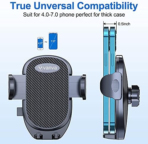 [ vanva Ultimate Car Phone Holder ] With the latest improved vent clip [Don't Slip & Drop], this car phone holder could hold your phone firmly even on the bumpiest road or sharper turn. This phone car holder is made from the most advanced durable sturdy aviation-grade materials,it is the first phone mount car to pass most extreme test on the market, making it more resistant to abrasion and corrosion. [ Screw the Vent Clamp Tightly & Secure Stable Install ] vanva car phone mount adopts the latest screw mechanial lock design which holds your phone securely to the vent. Screw the clamp and the rubber clip hook will catch one of the car air vent blades tightly, even if you hit a bump or a sharper turn. After take few seconds to install it well, which won't distract you from driving. [ Rotate Freely & Adjust Perfect Angle as You Like] Dual to the 360-degree swivel head, your phone can be rotated easily to landscape and poraits as well as anywhere in between, with the vanva car mount. This air vent car mount allow you secure your smartphone to the air vent firmly, keeping it in place whilst the optimal viewing angle. Easily lay and remove your phone using the widely comfortable phone cradle with instant release button. [ Hold Your Phone Stably & Drive without Distracting ] vanva phone mount holder has anti-slip rubber pads, stable support shelf, firm & scratch-free claw offer secure grip for your cellphone to ensure safer driving. With all above these, the stability increase 5 times, even can stable support big phones and thick cases. [ Fit Universally & Get 24 Months Worry Free Warranty ] You'll enjoy 24 months warranty. This cell phone car mount is fit foriPhone 15/ 15 plus/ 15 Pro/ 15 Pro Max/iPhone 14/ 14 plus/ 14 Pro/ 14 Pro Max /13/ 13 Pro / 13 Pro Max/ 12/12 Pro/12 Pro Max/12 Mini/SE/ 11 /11 Pro /11 Pro Max /XS / XR / XS Max / X / 8 / 8 Plus / 7 / 7 Plus / SE / 6s / 6 Plus / 6 / 5s / 5, Samsung Galaxy S10 / S10+ / S10e / S9 / S9+ / S8 / S8+ /Note 10+ /Note 10 / Note 9/Note 8/ S7 / S7 Edge etc.