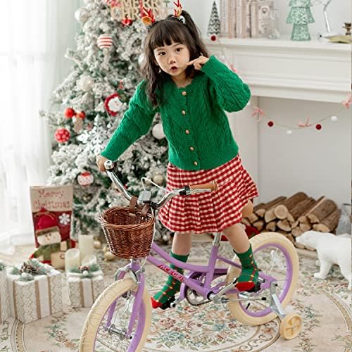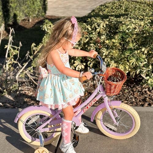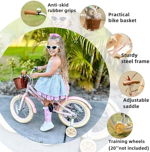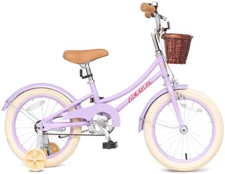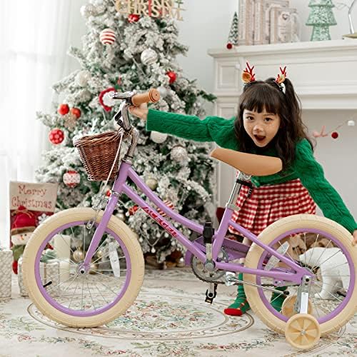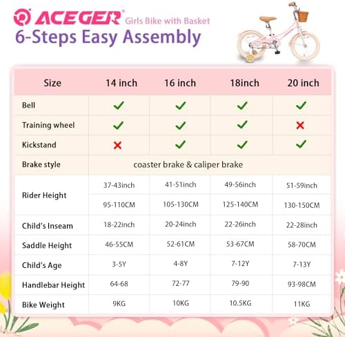 ⭐14 Inch Bike : Designed for girls ages 3-5 years, best fit for riders with an inseam of 13" to 16". The 14” bike with training wheels provides an easy transition from balance to pedal bike./16 Inch Bike : Designed for girls ages 4-8 years, best fit for riders with an inseam of 13" to 16". Teach your child to ride with kickstand instead of training wheels./20 Inch Bike : Designed for girls ages 7-13 years.It only has kickstand,no training wheels.Big Adventure for elder girls.    ⭐Safety and High Quality : Lightweight but sturdy frame for safety. Optimized an air-filled tires to filter the road vibration to make riding more comfortable.    ⭐Lovely Components : Soft handlebar grips, reflectors and a bell are included. The extremely cute wicker basket to let the kids pack all the stuffed animals or snacks...    ⭐Easy Assembly : Includes all the tools for easy instructions. Out of the box and riding in less than 10 minutes.    ⭐Assembly Attention: about pedal, LEFT pedal – rotate pedal axle ANTI-CLOCKWISE towards front of bike. RIGHT pedal – rotate axle CLOCKWISE towards front of bike. About fender, if the fender holder is too narrow, you can push it larger by yourself.