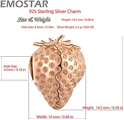 ?Inspiration? Adopting a cute strawberry figure, which means sweet love, the appearance of a strawberry is a heart shape, which represents a beautiful and sincere heart. It is very suitable for your lover. pets, it will surely remind you of the laughter and happiness you have with them. ?Material? Emostar strawberry charm is made of authentic 925 sterling silver beads and rose gold plated. It is smooth, 100% safe for sensitive skin. ?Suitable for Bracelet/Necklace? This hole size of strawberry charm is about 0.18inch/4.5mm, It is compatible with Pandora, Chamilia, Kay, Troll, Carlo Biagi, Zable or other european brand bracelets. ?Idea Gift for Women/Men? Purchase this bead charms for your lover, wife, husbands, mother/mom, grandma, girlfriend, aunt, daughter, sister, family, best friend or even yourself. As a gift it's suitable for Peace Lovers or Anniversary. ?Package and Service? 1 sterling silver strawberry charm + 1 silver polishing cloth + 1 small jewelry bag + 2 rubber rings. Quality Assurance, Please feel free to contact us if you have any concern about this item. We will try our best to promise you an enjoyable shopping experience.         #286,922 in Clothing, Shoes & Jewelry ( )   #724 in