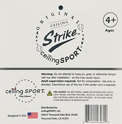 Fun Baseball Toys Set: ceilingSTRIKE is the top ceiling toy baseball toddler and kids game! Throw strikes safely from your bed, chair, floor, office, dorm, playroom, or anywhere with a flat ceiling. Perfect Baseball Gifts: For that little tyke, the youth or tball baseball accessory lover, franklins everywhere. Ideal kid toys for boys or girls ages 4-8, games for kids 8-12, or baseball room decor. Unlimited Benefits: Replace your toy baseball set with a ceilingSTRIKE. This baseball training equipment enables children of all ages to develop their muscles, hand-eye coordination and also helps to build focus and attention. Safe and Lightweight: ceilingSTRIKE is made of lightweight material and passes all current ASTM F963-17 Standards for Consumer Safety Specification for Toy Safety and US Consumer Product Safety Improvement Act of 2008 (CPSIA) with amendment (H.R.2715). Safe for children age 4 and above. U.S. Patent No. 10,646,762. Easy to Set Up and Money-Back Satisfaction Guarantee: No additional hardware or tools needed. Install and play in minutes by following quick four-step process. Adult supervision required. Within the first 30-days of receipt of your game, if you are not completely satisfied with your ceilingSTRIKE game for any reason, return it for a 100% refund or we’ll provide a new game for free.