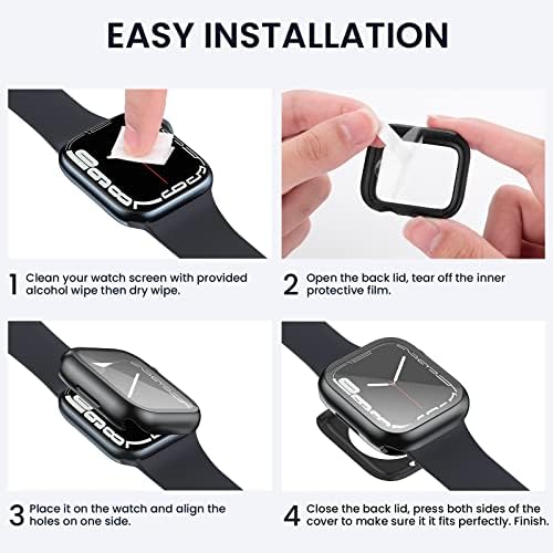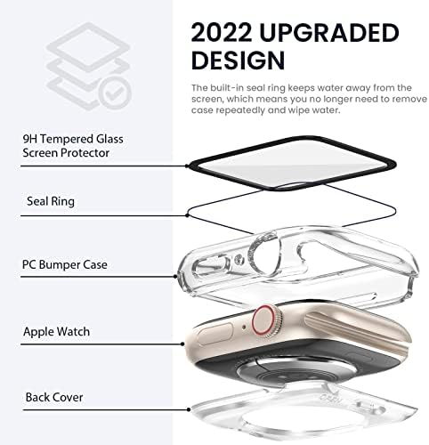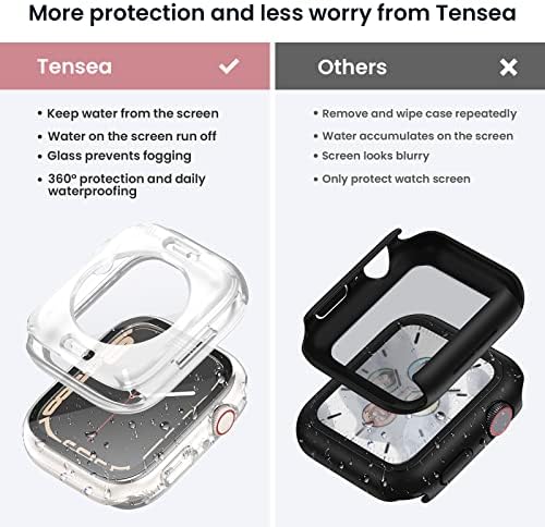 【COMPATIBILITY】The Tensea watch case is tailored to fit Apple Watch SE 2023 40mm, SE 2nd 40mm & SE Series 6/5/4 40mm perfectly. Bumper cover built in screen protector give nice snug fit. NOTE ❌: Not compatible with Apple Watch SE 2023 44mm, SE 2nd 44mm, SE Series 6/5/4 44mm, i Watch Series 8/7 41mm 45mm, Series 3/2/1 38mm 42mm, Apple Watch Ultra2/Ultra 49mm or other models.    【DAILY WATERPROOF】The apple watch se/6/5/4/se gen 2 40mm screen protector built-in seal ring keeps water away from screen, which means you no longer need to remove case repeatedly and wipe water. It is waterproof perfectly for daily wear - showering, hand washing, sweating, rain, etc. The oleophobic coating on the surface of tempered glass will not cause water to collect on the glass. [NOTE: Not suitable for deep waterproofing, such as diving and swimming, etc.]    【360° PROTECTION】This compatible iWatch 40mm face cover which can all around protect the front and back of your watch from dust, dirt, scratches and damages. These 9H tempered glass screen protector don’t affect the touch sensitivity. The sweatproof watch case is easy to install without removing the band.    【UPGRADED MATERIAL】The anti-scratch tempered glass is 9 grade hardness. The shock-absorbing PC material is more hard, tougher and protective than traditional TPU. Glass can prevent fogging caused by the difference in temperature between cold and hot.    【Easy Installation】There is installation video on our product page and instruction is included in the package.【Easy Removal】- A removal tool is included to remove the case without damaging the watch.【What You Get】1 x 40mm Apple Watch front case, 1 x back cover, 1 x removal tool, 1 x cleaning tool. ( Smart watch, band and charger are not included ) All our products have limited one-year after-sale service. So if there are any problems with it, please contact us without hesitation.