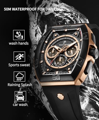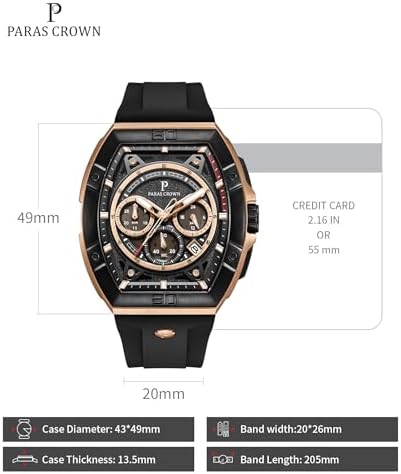⌚【FASHION AND ClASSIC】PARAS CROWN men's watches are meticulously crafted in a vintage style, featuring a Tonneau case that seamlessly blends oriental aesthetics.They incorporate a clever combination of colors, materials, and manufacturing techniques to create a fashionable and classic look. ?【304 STAINLESS STEEL CASE】PARAS CROWN men's wristwatches have a masculine look with a large stainless steel case measuring 49x45mm (1.93x1.77 inches). The stainless steel case not only provides exceptional durability and corrosion resistance but also extends its longevity. ?【BEST GIFTS &24-MONTH ASSURANCE】Every watch comes with a beautiful box, perfect for Thanksgiving Day,Christmas,New Year,Birthday,Wedding,Graduation,Valentine's Day,an ideal gift for father, husband, boyfriend, or brother. ?【Miyota JS25 MOVEMENT 】PARAS CROWN men's luxury watch features the Miyota JS25 Japanese quartz movement, which is renowned for its precision and reliability. Whether you're dressing up for a formal event or going for a casual look, this watch will complement your style perfectly. ?【5ATM WATERPROOF】After undergoing strict testing, the watch has been rated as waterproof up to 50 meters, which effectively protects the watch from splashes, rain, hand washing, sweat, cold water, and daily wear. #205,616 in Clothing, Shoes & Jewelry ( ) #850 in