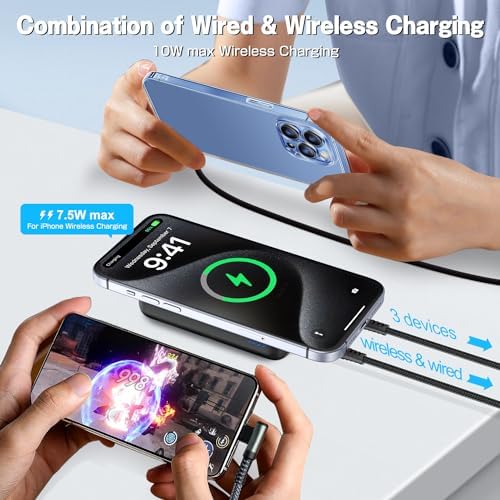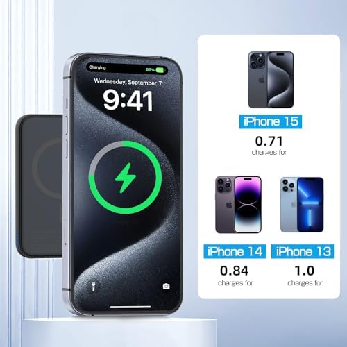 Powerful Magnetic Suction - For magsafe portable charger comes with up to 10N magnetic only for iPhone 15 pro/pro max/mini, iPhone 14 pro/pro max/mini, iPhone 13 pro/pro max/mini, and iPhone 12 pro/pro max/mini, which can easily and stably attach to your phone so that you don't have to worry about being disturbed while you're gaming/talking/taking photos with your cellphone due to charging. Wireless Charging - Say goodbye to the annoying data cables. The wireless charging mode of the portable power bank is not only tailor-made for iPhone 8/X/Xs/Xr/11 and newer models but also for Samsung Galaxy, etc other Android phones that support wireless charging. 【NOTE: The wireless magnet power bank is only compatible with mag-safe case】 5000mAh Multi-Device Charging - The wireless portable charger combined with USB C and USB A ports widely works for most devices, which means you can charge up to 3 of your devices at the same time, or share with two of your best friends or families. 5000mAh small battery charger is just right for you, to be your phone's second battery pack. Slim & light Body - Only 0.56-inch slim and 4.3 oz light as you want, the small size just a little bigger than a bank card will not block the phone camera. It is the perfect travel companion to put in your pocket, in your bag, and anywhere. Safety Protection - Built-in premium chips and a powerful safety system provide overcharge/overcurrent/over-discharge/overvoltage/short circuit protection. The portable phone charger has passed repeated multiple tests and can be used with peace of mind. and It is allowed to be taken on the plane.