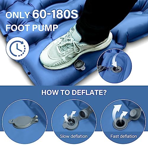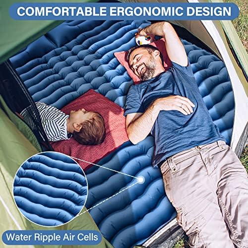 ☀ EXTRA THICK & WIDE 2 PERSON CAMPING PAD☀ If you are tired of those cramped ones, this double sleeping pad will meet your needs, up to 79.8"*53.5" when inflated, big enough for 2 tall people. The 4" thickness allows your body to keep off the hard ground, providing better support whether lying flat or on your side for a good night's sleep during camping. ☀ EASY TO INFLATE & DEFLATE ☀ The inflatable camping pad is equipped with a built-in foot pump, which can be fully inflated by stepping on it for 1-3 minutes, with no mouth or additional air pumps. The two double-layer valves on the pillows can effectively prevent air leaking and deflating in seconds. NOTE: Inflation time depends on how fast you pedal, and the hardness of the air pad depends on how much you prefer to inflate. ☀ RESISTANT & COMFORTABLE CAMPING MAT ☀ 2 Person Camping Sleeping Pad is made of camping grade 40D nylon and TPU-coated hard-wearing and no tearing fabric for many different terrains, resistant enough for the harsh outdoors. Ergonomic design and pressure-dispersing water ripple design bring a comfortable camping experience. ☀ THE BEST ULTRALIGHT COMPACT SLEEPING MAT ☀ This double camping mattress only weighs 3 lbs and can be compressed to 12*5.9*5.9 inches, which is as small as a water bottle. With a built-in air pump and pillows, there is no need to carry extra pillows. It fits easily in your backpack, and it's ultra-light and space-saving, you can take it with you wherever you go backpacking, hiking, climbing, camping, and traveling. ☀ 100% RISK-FREE PURCHASE ☀ We offer a one-year warranty for this camping mat. We hope you are pleasure with this 2 people camping sleeping pad! Owning it will bring you more happiness. If you have any questions or suggestions, please feel free to contact us! Besides, this camping mattress is easy to clean, if there is any dust or dirt, just wipe it down with a damp cloth.