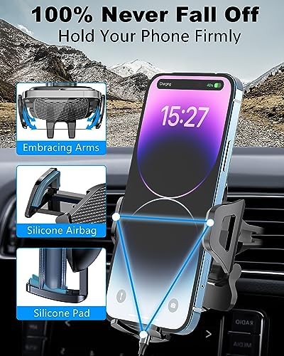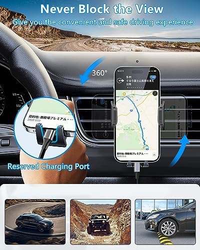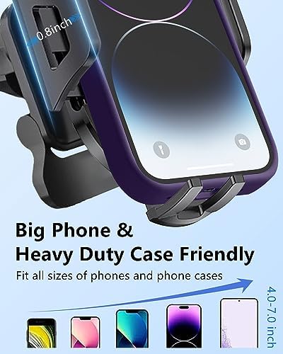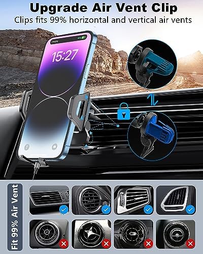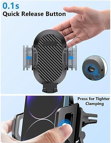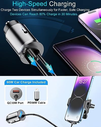 【3-in-1 Car Phone Charger Mount】: Worth having a try! C07A-L car mount charger for iphone combines car phone holder, 60W fast car charger, 4ft apple cable and vent clip in one set, which can be freely mounted on vent and fast charge your phones. The cell phone holder is suitable for most vehicles, including cars, trucks, SUVs, and taxis, making it the perfect assistant for drivers. Stay connected and hands-free while on the road with the this phone car mount.    【30W Fast Charging Cable for iPhone】: 60W USB car charger built-in 4ft Apple Cable, supports PD30W super fast charging protocol, can provide super fast charging speed for iPhone 14/13/13 Mini/13 Pro/13 Pro Max/12/12 Pro/12 Mini/iPhone SE 2020 /11 /11 Pro / X / XS/ XR / XS Max / 8 / 8 Plus; In addition, with another QC30W USB port, you can use it with your family and friends, and it will even be a great helper for your long trip.    【Easy Operation】: With the quick-release button and adjustable clamp arms, The Car phone holder makes it very easy to lock and release your phone with just a single hand. Provide you with safer driving whether you are talking, navigating, listening to music or charging. Adjustable feet fit for iPhone, Samsung and all cell phones(4.0-7.0 inches) even with thick phone cases.    【Adjust Angle as your wish】: With the 360-degree swivel head on the car phone holder mount, your phone can be rotated easily in landscape and portraits without obstructing your view. Get the best view for your driving trip and see the phone screen easily and clearly. Just enjoy more convenient and safer driving.    【Full Protection&Super Stable】: This phone car holder's vent clip adopts the latest triangle mode vent clip [Never Fall Off & Won't broken]. Easily hold your phone firmly no matter on bumpy roads or driving. And this cell phone holder car features a solid clamp arms and strong scratch-resistant bottom tray to provide full protection for your phone. These technological structures ensure your smartphone sits firmly in the car phone holder while driving, without distracting you from driving.    【Wide Compatibility, What You Get】: The package includes a Car Vent Phone Mount, a 60W car charger adapter, and an air vent mount.