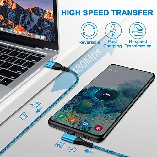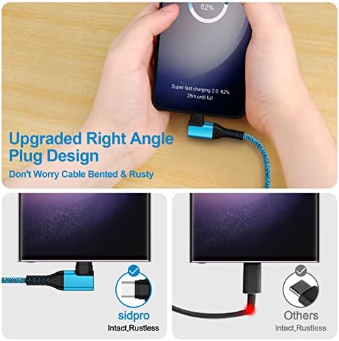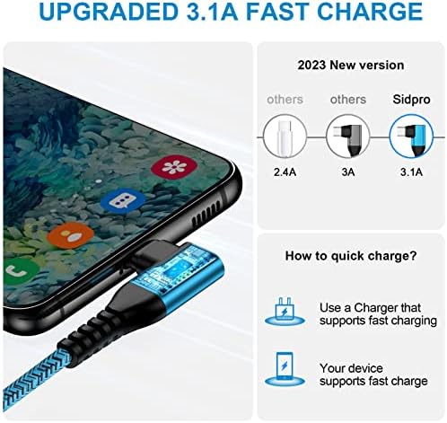 【3.1A Fast Charging & Sync Speed】: Samsung Galaxy S24 Android Charger Cable Fast Charging supports high-speed charging up to 3.1A (40% faster) compared with other cables. And data transfer speed up to 480Mb/s.    【Broad Compatibility】: Type C Cable Fast Charging for Samsung Galaxy A15 5G A25 A14 5G A54 A53 A13 A12 A04s A03s A02s A23 A24 A42 A32 A10E A11 A20 A21 A50 A51 A52 A70 A71 A72 A32 S24 S24+ S24 Ultra S23 S23+ S23 Ultra S22 S22+ S22 Ultra S21 S21+ S21 FE S21 Ultra S20 S20+ S20 FE S20 Ultra S10e S9 S8, Note 20 Ultra/10/9/8, Google Pixel 8/8 Pro, 7a/7 Pro/7, 6a/6 Pro/6, 5a/5, 4a/4XL/4, 3a XL/3a/3XL/3, Moto G Pure/Power/Stylus/Fast/Play, One 5G Ace, G100, and other usb type c device.    【Advanced Right Angle Design】: Compared to conventional charging cables, this samsung galaxy a14 5g cable features an ergonomic 90° Right Angle "L" design that may effectively prevent typical wear, straining cable and connection issues and increase the life of the charging cable. Samsung galaxy s24 ultra charger cable user-friendly design more convenient and comfortable for playing games, watching videos, and reading e-books when you charging.    【Enhanced Cable Durability】: Reinforced 90 degree Samsung S24 Charger USB C Cable has electronic safety certifications that comply with appropriate standards. The premium nylon braided design enhances the durability of the cable. which makes the usb android cable more sturdier than normal cables but also tangle-free. With 40,000+ times bend test, the flexible and durable double-braided nylon type c fast charger cord longer service life and will never rupture.    【What You Get 】: 2-Pack 6ft Nylon Braided Type C Fast Charging Cable(Blue&Purple). 24-hour friendly customer service, 30-day free refund or replacement, 12-month worry-free warranty. If you have any question, please feel free to contact us by email.