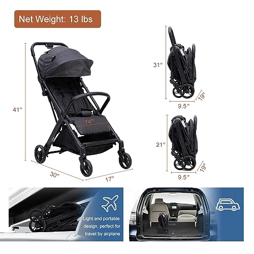 Effortless Gravity Automatic Fold: Our innovative Lightweight Baby Stroller features a gravity automatic fold mechanism, allowing you to effortlessly fold it with just one hand. No more bending down, making it convenient for parents on the go Easy One-Hand Unfold and Automatic Fold-Lock: With our stroller, unfolding is as easy as folding. Simply use one hand to unfold it effortlessly. Plus, the automatic fold-lock ensures that the stroller stays securely folded when not in use Compact and Ultra-Light Design: Designed to be small and portable, our Lightweight Baby Stroller is perfect for shopping or traveling by airplane. It folds super small 21.65*19.3*9.45 inches, making it easy to carry and store. Its ultra-lightweight construction makes lifting hassle-free, only 13lbs Adjustable Backrest, Footrest, and Canopy: We understand the importance of comfort for your little one. Our stroller features adjustable backrest and footrest positions, allowing you to find the perfect angle for your child's comfort. The adjustable canopy provides protection from the sun, and the peek-a-boo window allows you to keep an eye on your baby at all times Safety Certified: Rest assured knowing that our Lightweight Baby Stroller has passed rigorous safety tests. It meets the ASTM F833-21, CPSIA, and CPSA standards, ensuring the highest level of safety for your child