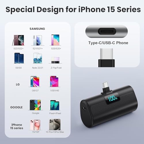 【Important: For USB C Charging!!】Portable charger power bank is compatible with iPhone 15 series: iPhone 15/iPhone 15 Plus/iPhone 15 Pro/iPhone 15 Pro Max, Samsung Galaxy, Motorola, Google Pixel, LG android phone and other USB C devices. Directly Plug-in USB C Phone and Charge iPhone 15: mini portable charger will not harm your phone battery, NO pop-ups, you can plug into your phone and charge anytime, and LCD indicator shows the current remaining power. ♥This Portable Phone Charger supports phone case thickness less than 4mm♥ Mini as a Lipstick, Daily or Travel Essential: Only 98g, size is 3.9*3.5*1 inch, the small power bank for iPhone 15 series is lightweight and compact, easily to fit into your purse or pocket, taking little space. HETP Advantage: Portable Phone Charger uses a high energy density battery cell, latest antioxidant process interface, 100% aging pass rate, tens of thousands of continuous drop test; 5200mah emergency battery backup normally charge most type-c android phones around once, safe capacity allows you to use in airplane. PD Fast Recharging: Cordless portable power banks with PD quick speed charging, the USB C port on the left supports input/output, you can charge any devices or recharge the cell phone external battery pack at 3A high charging speed. You Will Get: 1 x 5200mAh USB C portable charger for iphone 15 series, 1 x USB C cable, 1 x user manual. 365 Days warranty guarantee and 24 Hours friendly customer service.