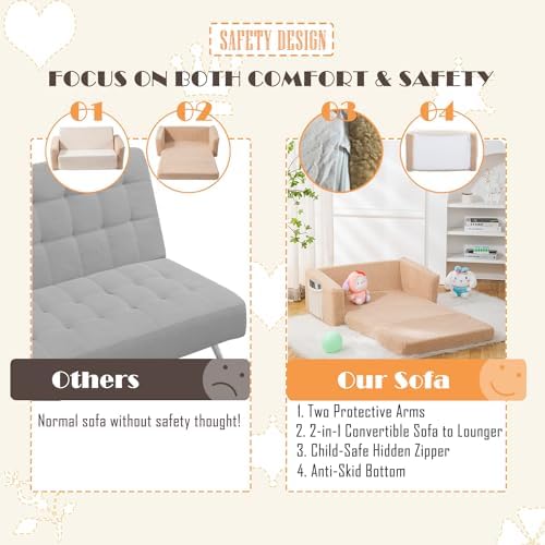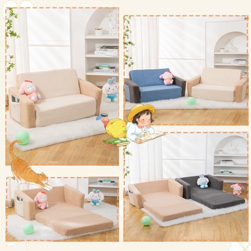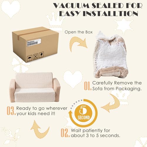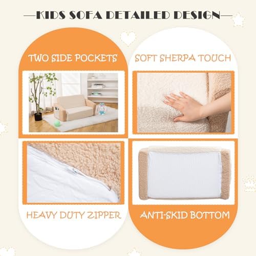 ✿【CONVERTIBLE 2-IN-1 FLIP OPEN DESIGN】➤ The toddler fold out couch can also convert to a lounger bed which is ideal for sitting, reading, relaxing, playing or taking a nap. The extra wide feature allows 2 small children to enjoy their wonderful time or having fun    ✿【SAFETY DESIGN FOR KIDS & TODDLERS】➤ The cover of SUFUS extra wide kids sofa couch is made of high quality Sherpa which is durable, odor-free and Hypoallergenic. The bottom is tailored with anti-skip material to add extra safety. The child-safe hidden zipper is designed to prevent accidental opening by kids or unexpected bites by pets. You could use a paper clip to open and close but don't forget to remove it once you've finished    ✿【FRIENDLY DESIGN FOR KIDS & TODDLERS】➤ The lightweight toddler sofa chair for boys & girls is portable and easy for kids to move from room to room to read, play video games or watch TV. The double side pockets are a creative design for kids to store their favorite story books, dolls or plush toys    ✿【COMFY FOAM CONSTRUCTION & MACHINE WASHABLE COVER】➤ High density and hardness of the supportive foam keeps the sturdy toddler sofa couch in shape and provides our lovely kids all-day comfort. Its premium quality also ensures immediately expansion without needing long time waiting. The removable cover with a zipper can be easily taken off and washed in the machine in cold water, making maintenance a breeze. BUT you need to MARK each foam before washing for easy reinstallation    ✿【PERFECT GIFT FOR BOYS & GIRLS】➤ The children's sofa couch is a wonderful gift for all kids & toddlers as Birthday, Christmas or Anytime Present! With both modern design and fashionable colors, this foldable small couch can fit any rooms and add great vitality to your house    ✿【VACUUM SEALED FOR NO INSTALLTION REQUIRED】➤ The toddler sofa couch is in vacuum packing. Simply unbox it and wait patiently for about 3-5 seconds, then you will get a soft Sherpa Sofa for your kids. Premium quality foam allows immediately expansion without needing long time waiting for 24 hours or more. A THREE-YEAR WARRANTY is offered against manufacture's defect