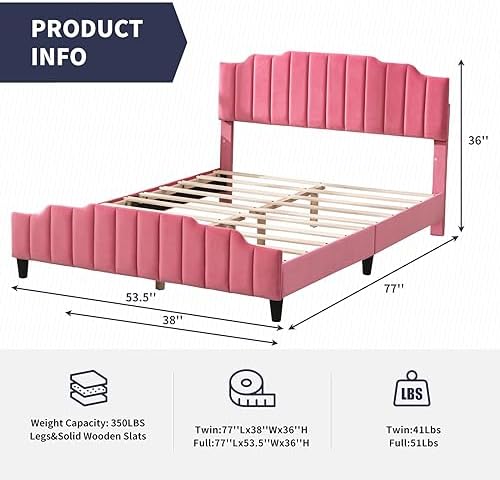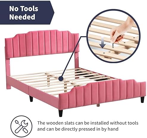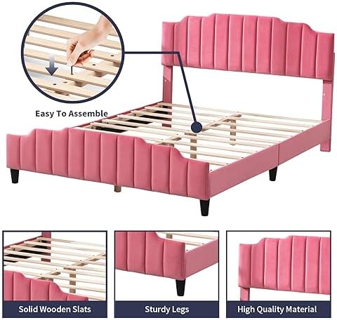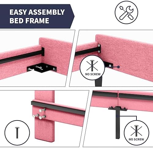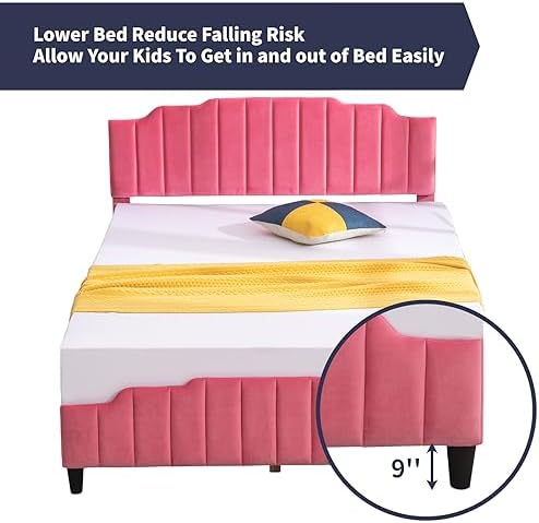 [Charming Dreamy Design] This girls' bed frame is a dream come true for little princesses, featuring an all-pink color scheme and adorable patterns. Upholstered with comfortable and durable sponge, it creates an inviting and delightful pink haven for your little ones to play and enjoy sweet dreams.    [Built to Last and Stable] Crafted from high-quality wood, this platform bed frame offers exceptional durability. Its central cross-wood support ensures the mattress remains firm and extends its lifespan.    [No Need for a Box Spring] With sturdy slat support, there's no need for a box spring, saving you both time and money. It's designed to work seamlessly with latex, memory foam, and standard mattresses.    [Effortless Assembly] The robust structure guarantees a stable and peaceful night's sleep. Assembly requires no tools, and each part is clearly described in the project instructions, making installation quick and hassle-free.    [Exceptional Service] The bed is securely packaged in a box. If you encounter any issues with our products, please don't hesitate to reach out. We're committed to responding to your inquiries within 24 hours.