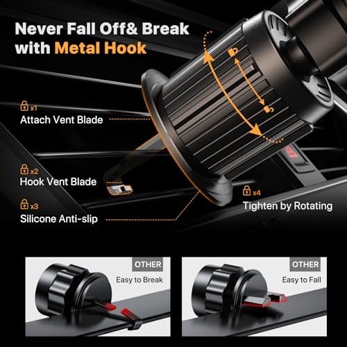 【Never Fall Off-Metal Hook Design】Miracase car phone holder adopts simplified locking design. The steel metal hook will catch one of car air vent blades and provide excellent strudiness. It will work well for your car even in extremely harsh environments 【One-hand Operation】With quick release button, adjustable clamp arms and foot, Miracase car phone mount makes it very easy to insert and remove your phone with single hand. Provide you with safer driving whether you are talking, navigating, listening to music or charging. 【Universal Compatibility】Miracase cell phone car mount is compatible with all phones (4.0-7.2 inches) and thicker cases. 【360° Flexible Rotation】The 360-degree rotatable design will provide you with the best viewing angle to keep secure driving. You can place your phone in any orientation (landscape, portrait and more), Just enjoy the best drving experience. 【 Professional Support】Please feel free to contact us for any product issues, a satisfying solution is promised forever.