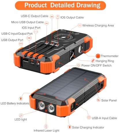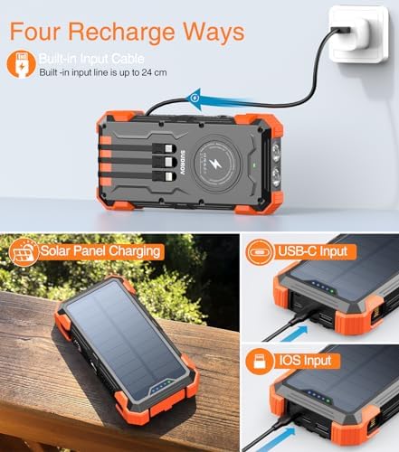 [Built-in 4 Charging Cables] This power bank is built with 3 output cables ( Type C*1 & iOS*1 & Micro USB*1) and 1 USB-A input cable. No matter output or input, you don’t need to carry charging cables. Get rid of messy cables, charge at anytime and everywhere.    [Advanced Wireless Charging] This portable charger supports advanced wireless charging, compatible with all wireless-enabled devices. Such as iPhone 15/14/13 series, Samsung Galaxy S23/S22/S21 series, etc. Put your device on the wireless charging area, it gets charged immediately. Come and enjoy your cable-free charging time.    [Power 6 Devices at Once] This solar charger is also equipped with 4 ports (iOS input, USB A output, USB C input/output), providing 5V/3A high-speed charging to save time. Along with 4 charging cables and wireless charging, it supports charging 7 devices simultaneously. Keep all your devices alive. Sharing with families and friends is perfect.    [Super Large Capacity] With 42800mAh premium Li-polymer battery, this solar power bank can charge your devices multiple times. It can be recharged via adapter and solar power, free your worries of poweroff. Equipped with smart protection IC chip, it guarantees charging safety intelligently.    [Sturdy&Durable Design for Outdoor] This solar battery pack is well made to be Waterproof/Shockproof/Dust-proof, which can withstand the harsh environment outdoors. It’s equipped with Dual super bright LED lights, a Must-Have tool for outdoor activities and home emergencies.    [Thanks for choosing us] Every SUDROV product is certified safe and provided with a lifetime warranty. We also provide professional pre-sales and after-sales service for you. Any questions, please feel free to contact us. We promise you a satisfactory solution within 24 hours.