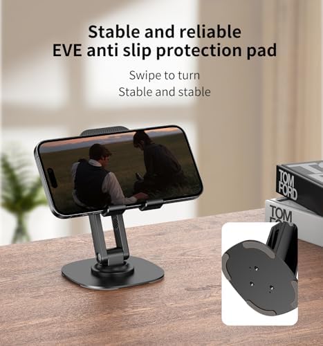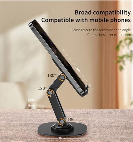 Adjustable Angle Viewing: Multiple Angles could be adjusted (360 degree rotating) to meet your different viewing demand. Makes you hands-free to enjoy your games, videos and Facetime    UNIVERSAL COMPATIBILITY: Our phone holder is compatible with all 4-8 inch smartphones, tablets and e-readers. Suitable for iPhone 15/14/13/12/11/Pro/Xs/Max Xr/X/8/7/6, Switch, Samsung Galaxy S10/S10+/S9/S9+/S8/S8+, Samsung Tab, Google Nexus, Kindle ,there are more!    Super Strong and Anti-Slip: Our phone holder is made of high-quality and sturdy aluminum metal, durable. Non-slip rubber pads on the base and back protect your device and desktop from scratches and sliding.    Foldable & Portable: This cell phone stand is adjustable to an ergonomic, eye-level viewpoint and typing position that supports your back and neck with a comfortable posture. It frees your hands, making it an excellent desk companion for watching videos, playing games, making phone calls, viewing recipes, and using Facetime.    Product details: Product size 3.62in*3.62in*1.9in-6.45in, product weight only 0.4 pounds.