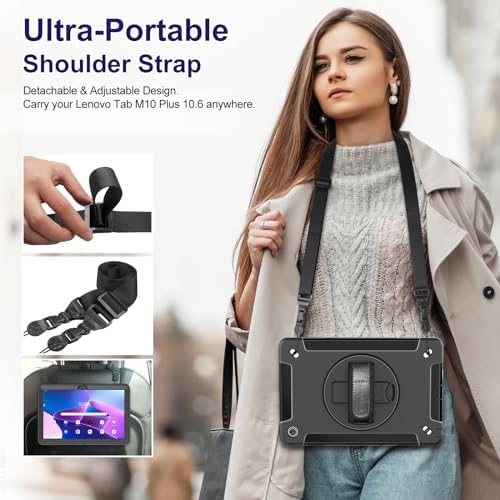 Miesherk Case for Lenovo Tab M10 Plus 3rd Gen: Military Grade Shockproof Case for Lenovo Tablet M10 Plus 10.6" TB-125F/TB-128F with Screen Protector-Rotating Stand-Hand/Shoulder Strap-Black