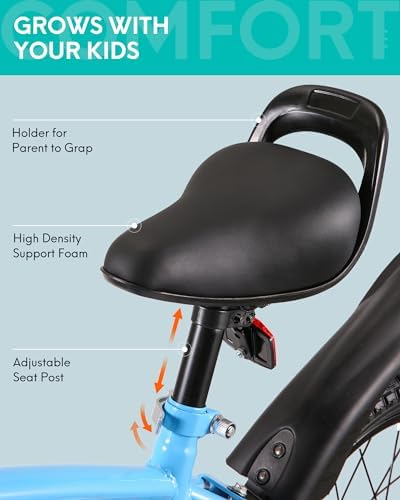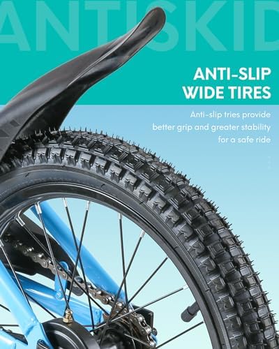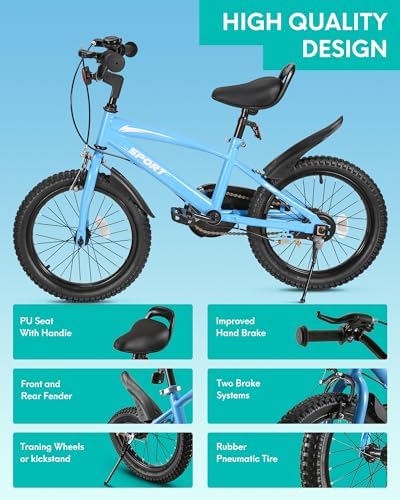 【Design for Kids 】1. This 16 inches kids bike comes with stable training wheel early. 2.Quick release seat simplify the height adjustment. 3.Saddle with holder to learn riding when the training wheel is off. 4.Foot brake suitable for young rider don't have enough power to manipulate the hand brake.    【Safe for Kids】Our kids bike bell around the handle and reflectors in many places, making it easy to drive during the day and at night. Detachable training wheels allow your child to ride a bicycle smoothly from beginner to being able to ride. Fully-enclosed Chain, effectively prevent clothing and other things involved in the chain resulting in child injury.    【Minimum Maintenance 】Made of premium steel to survive the bumps of learning, the durable steel frame is backed by our limited lifetime warranty. The kids bike comes with black tire & single speed, only little maintenance needed due to the simple design.    【Easy to Install】The 16" kids bike comes with 85% Pre-assembled body and the basic assembly tools, only pump needed for tire, normally takes a novice about 20 minutes to assemble the bike. If you have problem about assembly the bike, please contact us.    【Ideal Gift Choice】The kids bike with training wheels is perfect for beginner riders 41"-46" tall. Helping boys and girls age 4 to 10 years old learn to ride with confidence and fun.