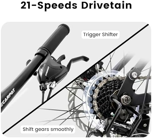 【Durable Steel Frame】26x17 inch sturdy and durable steel frame, provide safe and stable cycling experience. Ergonomically design, suitable for mens womens height 4'9"-5'3"(57-63 inches), max weight is up to 250lbs. 【21-Speed with Disc Brakes】Grip Shifter help to switch gears with smoothness. Simple operation allows for quick selection of gears for various terrains. Mechanical dual disc brake system, simple structure and convenient for maintenance. 【Front Fork+Shock Absorber】These all-terrain MTB feature shock-absorbing front and rear shock absorber. Dual shock absorbers provide double shock absorption effect, allowing you to ride smoothly and comfortably. The parallel bars can adapt to pressure road conditions. 【26*2.125" All-Terrain Tires】Made of high quality rubber, all-terrain tires with strong puncture ressistance soften the bumps and stick to the Dirt, Trail, Gravel, Paved Path for a smooth, stable ride: strong grip, have a super excellent anti-skid function and is not easy to slip. 【85% Pre-Assembled】The bike comes 85% pre-assembled. You need to assemble the handlebar, saddle, front wheel and pedals. After a short adjustment of the brakes and gears you can start riding immediately. Please note that if you have any questions, you could contact our customer service first.