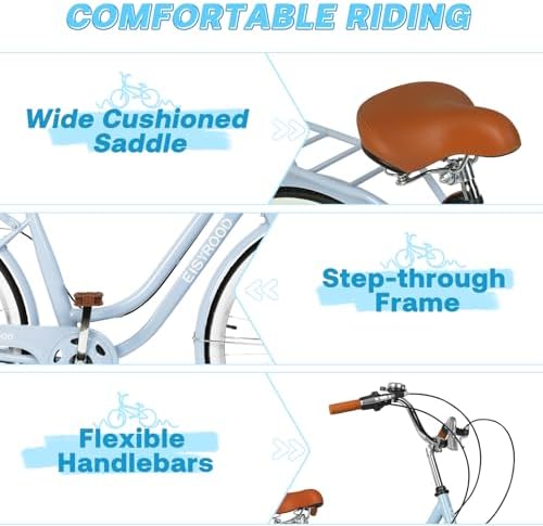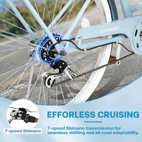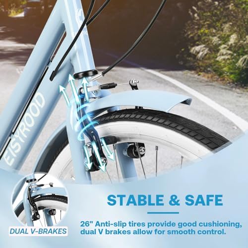 EISYROOD 26 Inch Beach Cruiser Bike for Women, Hybrid Cruiser Bike with 7 Speed, Adjustable Seat, Lightweight Women Beach Cruiser Bike with Anti-Skid Tires, V-Brakes, Pink & Blue