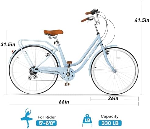 Sturdy and Stable -The frame features a double-beam construction for a stronger, more stable body structure and improved stability for high speeds and long distances, while the lightweight aluminum wheels provide a smooth ride and the front and rear fenders keep dirt and debris out, no matter what the terrain. The Beach Cruiser Bike is your first choice Ride with Ease - The Beach Cruiser is equipped with a 7-speed transmission system, which allows riders to smoothly switch gears according to different terrains, realizing effortless shifting. Whether you're traveling through the city or hanging out outdoors, the Beach Cruiser makes your ride simple and fun Stylish and Elegant - Fusing modern and classic elements, combining the vintage look of a comfort bike with modern functionality, the bike's low body design provides a more ergonomic, stable and upright riding position, relieving you of the burden and pressure of riding and allowing you to get a comfortable long ride Better Protection - Our city bikes feature dual V-brakes for superior braking power, both front and rear, and responsive braking to ensure immediate stopping in emergencies for a safer ride Assembly and Warranty - Beach Cruiser bikes are perfect for you and your family to recreational riding, outdoor excursions, etc. 85% pre-assembled, comes with detailed installation instructions and free tools for quick and easy installation, 24-hour customer support, full warranty and after-sales service