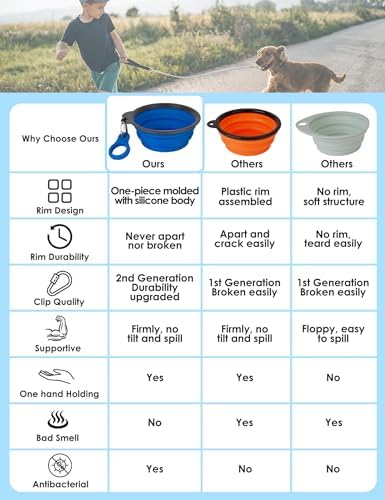 【Unique and Different】Aonkey dog bowl set is in a league of its own, addressing issues from feedback on other bowls. The upgraded carabiner boasts a larger, sturdier opening, reducing the risk of breakage. Plus, enjoy the added convenience of bottle carriers, compatible with most cola-shaped water bottles in the market. 【Revolutionary Structure】Say goodbye to the hassle of assembled plastic rings. Aonkey's foldable dog bowl boasts an upgraded structure, integrating soft silicone with a hard rim. No more worries about the ring coming off or cracking, and the clip hole remains intact. 【Unmatched Stability】Thanks to the integrated hard rim, our dog bowl stays sturdy when unfolded. No more spills or losing structure. Carry it confidently with one hand, even when it's full of water. 【Perfect for On-the-Go】These travel bowls are a breeze to pack since they collapse effortlessly. Clip them to a backpack or water bottle – ideal for outgoing to the park, hiking, driving, or any social activities with your furry friend. 【Safety First】Crafted from high-quality, food-grade silicone with a tempting beef flavor, our dog foldable bowl eliminates the typical silicone smell that dogs dislike. BPA-free, dishwasher safe, it's not just convenient but also healthy for your pet. #1,769 in Pet Supplies ( ) #4 in